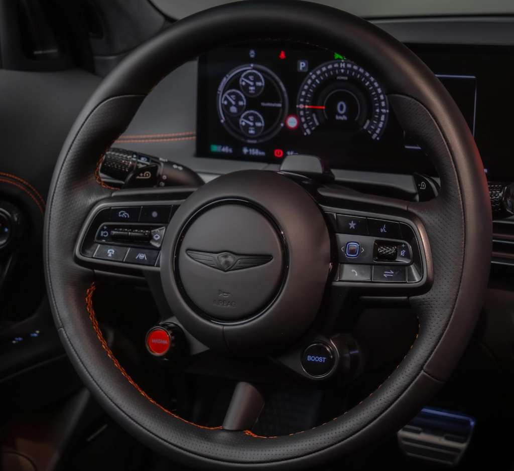 ההגה כולל אלמנטים ייחודיים לגרסת Magma, כולל עיצוב טבעת חדש וכפתור ייעודי המעניק גישה ישירה למצבי הנהיגה. שילוב תפרים בצבע כתום או בגוון לבן-אפרפר משלים את תחושת הספורטיביות.